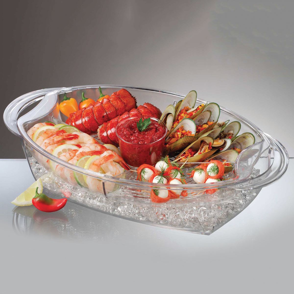 Bottom tray can be filled with cubed or crushed ice, while the upper four compartment vented food tray is positioned above the ice to keep food chilled and tasty. Removable dip cup is included. Bottom tray can also be used alone to serve a variety of foods, such as salads, pasta and more. Perfect for both indoor and outdoor entertaining. BPA free materials. Color box.