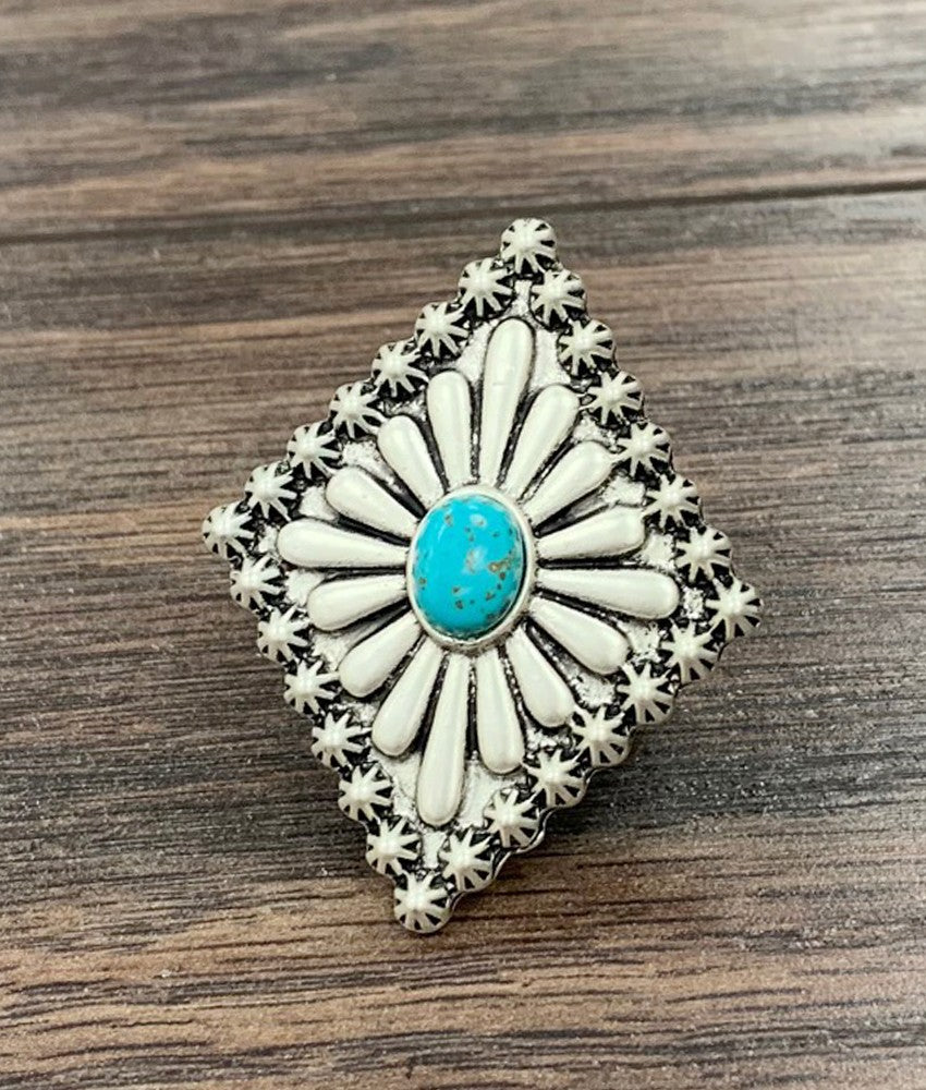 Big! 1.7" Long, Concho Turquoise Ring, Brass Dual Adjustable Band * Adjustable by expanding only both bands, not concho * Natural stone may vary in size, color or shape * One size, Adjustable by pull/push brass dual band * 1.7" concho on alloy metal, antique silver plate * 15 grams weight * Nickel, Lead & Chrome free