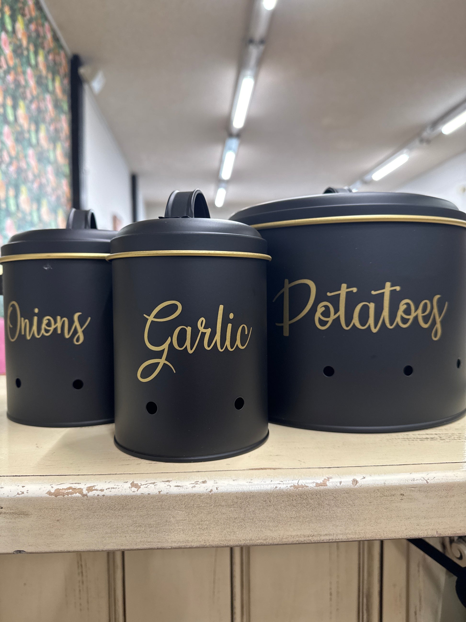SET OF 3 METAL CANISTERS-POTATOES/GARLIC/ONIONS